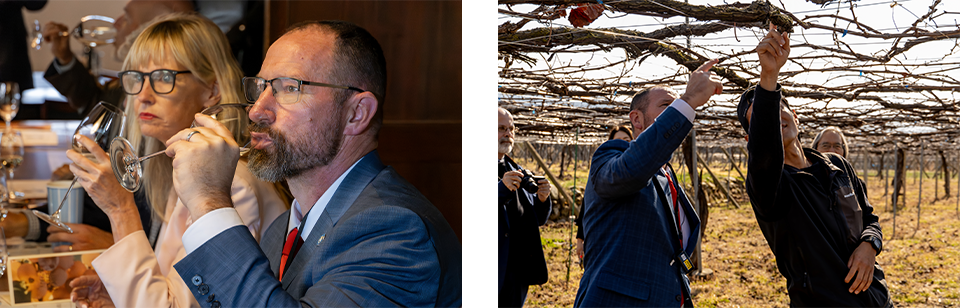 3月16日、一行は、「勝沼醸造」を訪問し、ワイナリー、ブドウ園などを視察しました。「勝沼醸造」は、100%国産ブドウを使用した日本ワインの生産にこだわり、日本固有の白ワイン用ブドウ品種「甲州」に特化したワイン造りを行っています。「たとえ一樽でも最高のものを」という創業以来の理念のもと、小規模ながら高品質なワイン造りを追求しています。